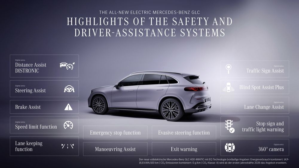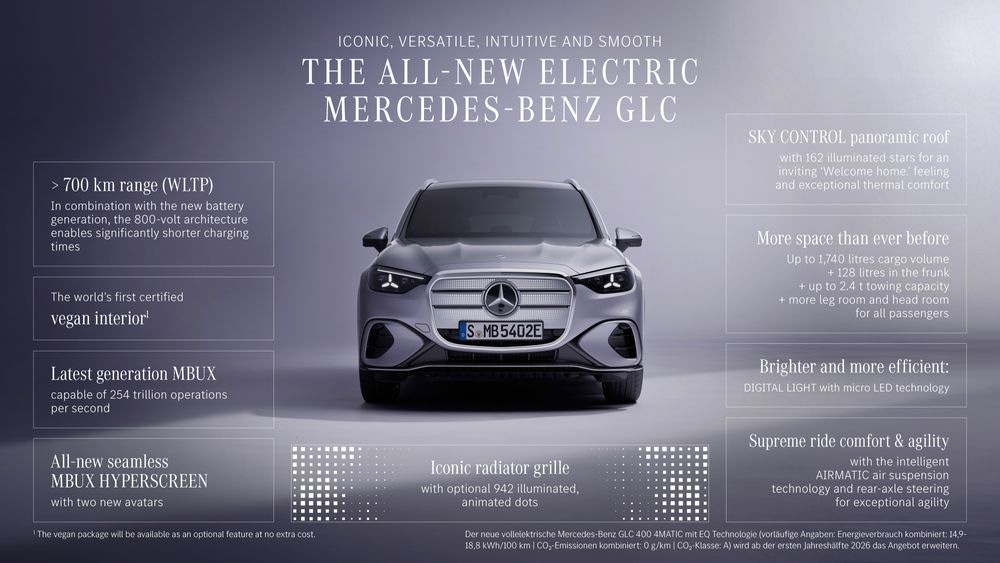 Zcela nový model GLC s technologií EQ představuje zlom v segmentu střední třídy. Je průkopníkem díky vylepšenému designu a inteligenci poháněné výkonným řídicím centrem MB.OS s umělou inteligencí. Jako první člen zcela nové rodiny vozů MB.EA byl konstruován s prioritou elektrického pohonu a vyniká výkonem, dojezdem, účinností a rychlostí nabíjení. Zároveň nastavuje nová měřítka ve své třídě v oblasti designu, užitné hodnoty, všestrannosti a prostoru: Zcela nové GLC nabízí ještě více prostoru pro nohy a hlavu než jeho sourozenci s konvenčním pohonem a také působivou schopnost utáhnout přívěsy o hmotnosti 2,4 tuny.