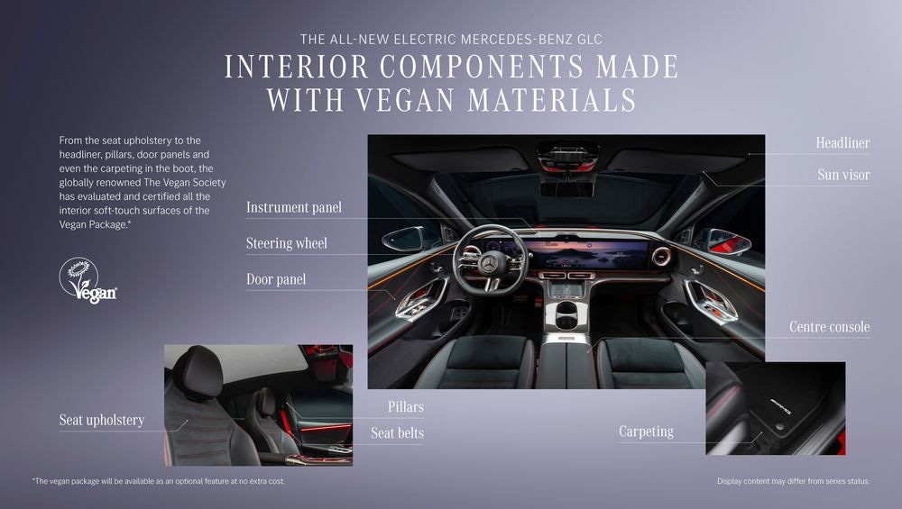 Mercedes-Benz také nastavuje nová pravidla v oblasti interiéru veganskou sadou výbavy. Tato honosná souprava materiálů pro interiér je certifikována organizací The Vegan Society. Mercedes-Benz se tak stává prvním výrobcem automobilů na světě, který nabízí nezávisle certifikovaný veganský interiér.